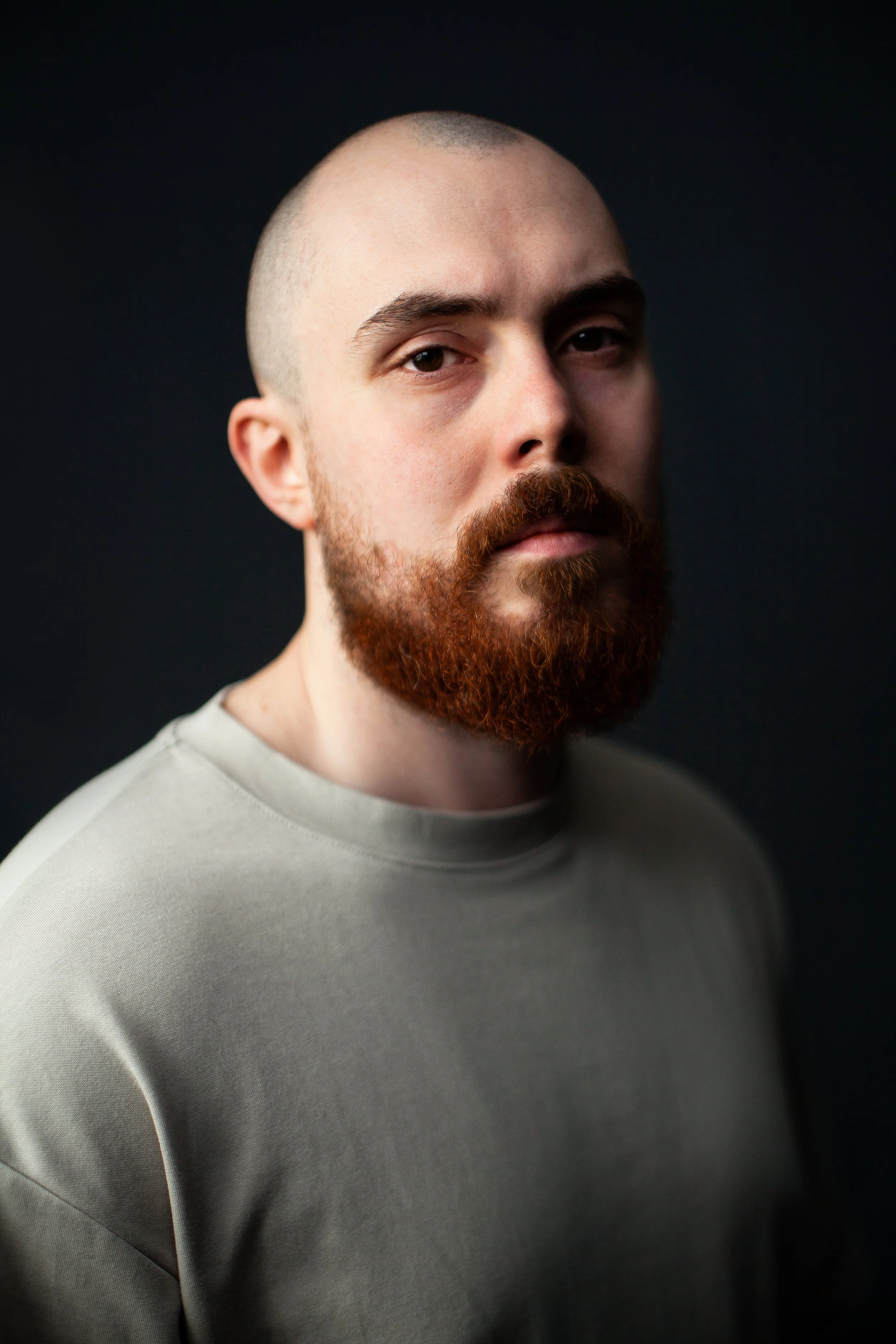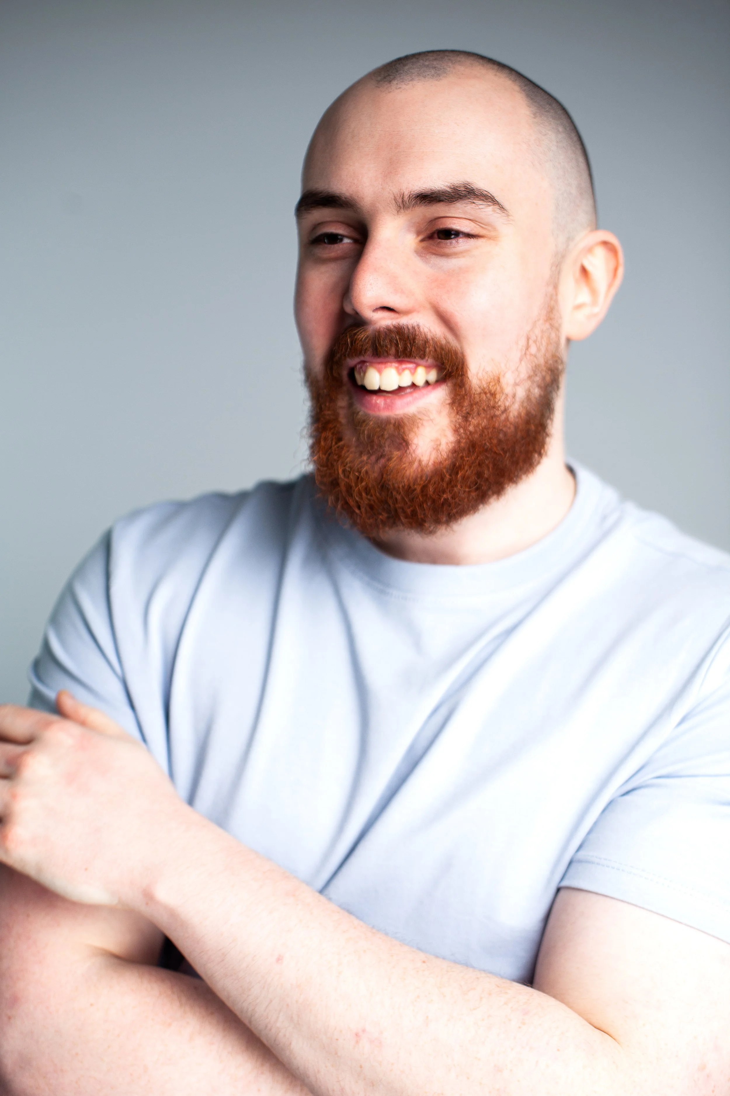 A portrait of a man with a shaved head, red beard, and light skin wearing a white shirt and teal-green button-up shirt against a dark background.