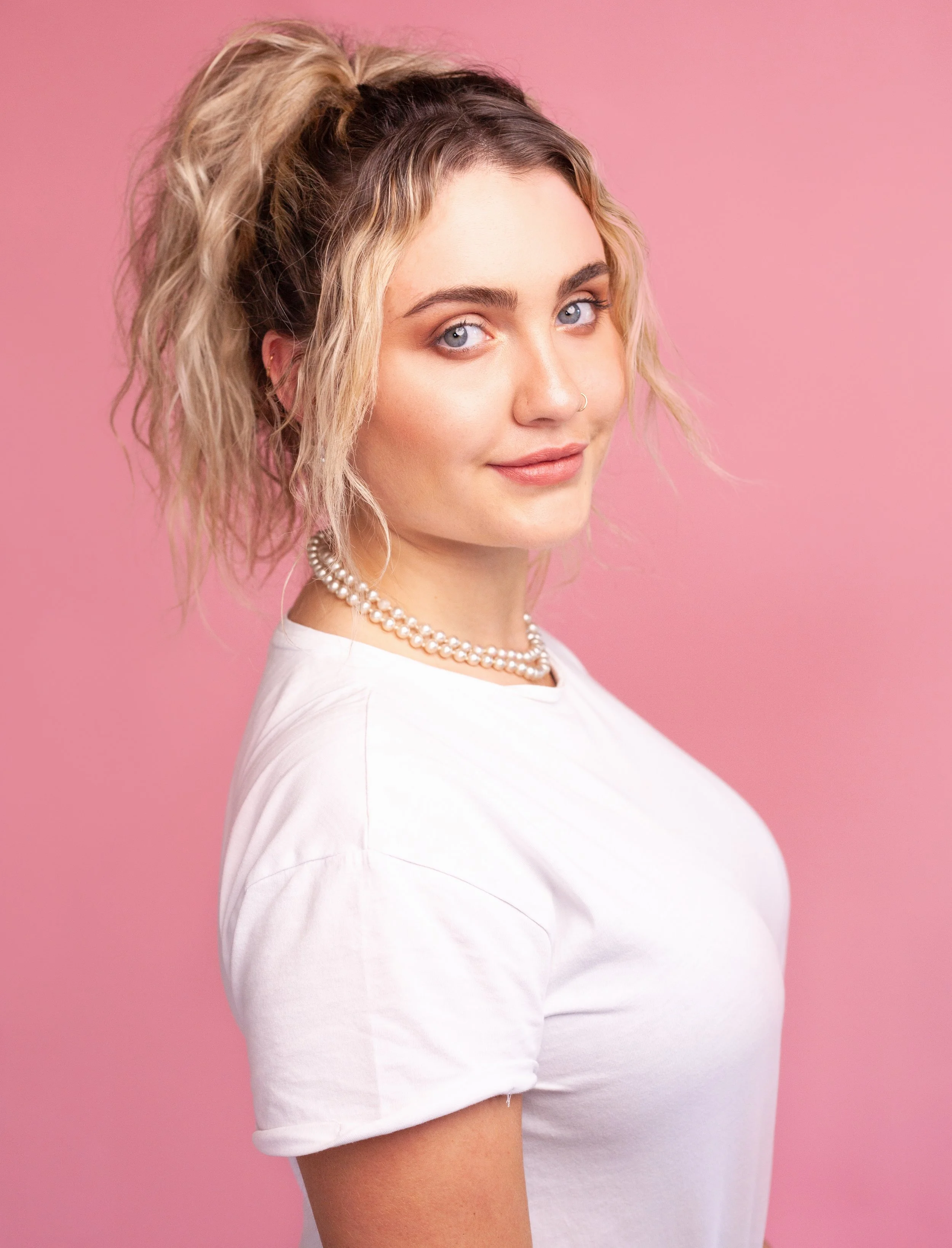 A young woman with curly brown hair, wearing a white T-shirt and earrings, standing against a pink background, smiling slightly.